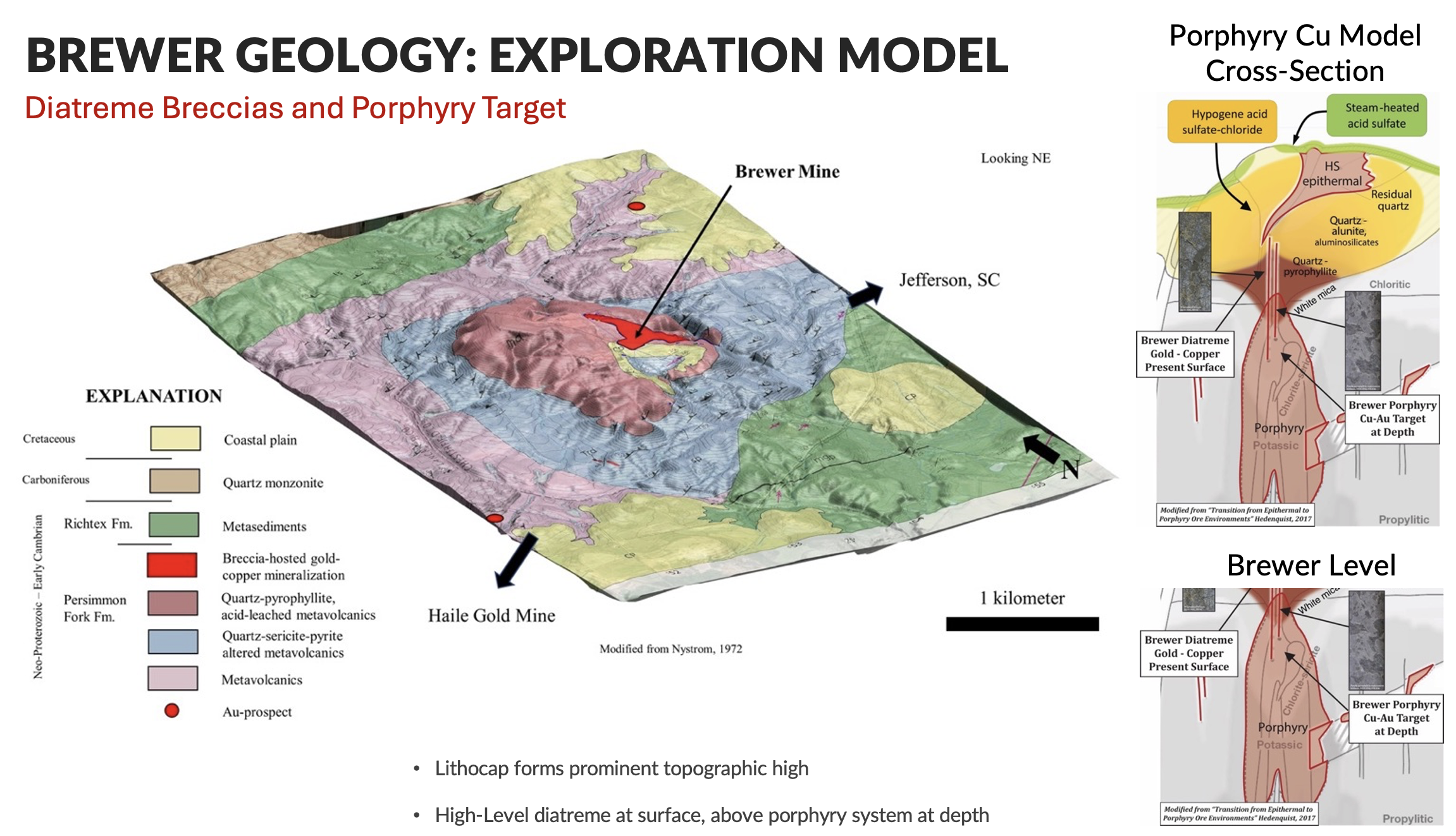 Brewer is a large, epithermal, high sulphidation gold-copper system driven by a sub-volcanic intrusive, possibly connected to a copper-gold porphyry system at depth (Schmidt, R.G., 1978, The Potential for Porphyry Copper-Molybdenum Deposits in the Eastern United States, U.S. Geological Survey).